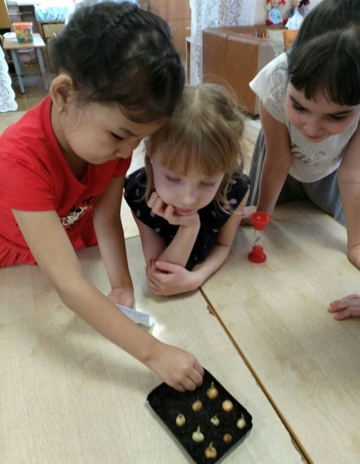 Материал и оборудование: два контейнера с землей и проросшим луком (один стоит на солнышке, а другой поместили в темное место).