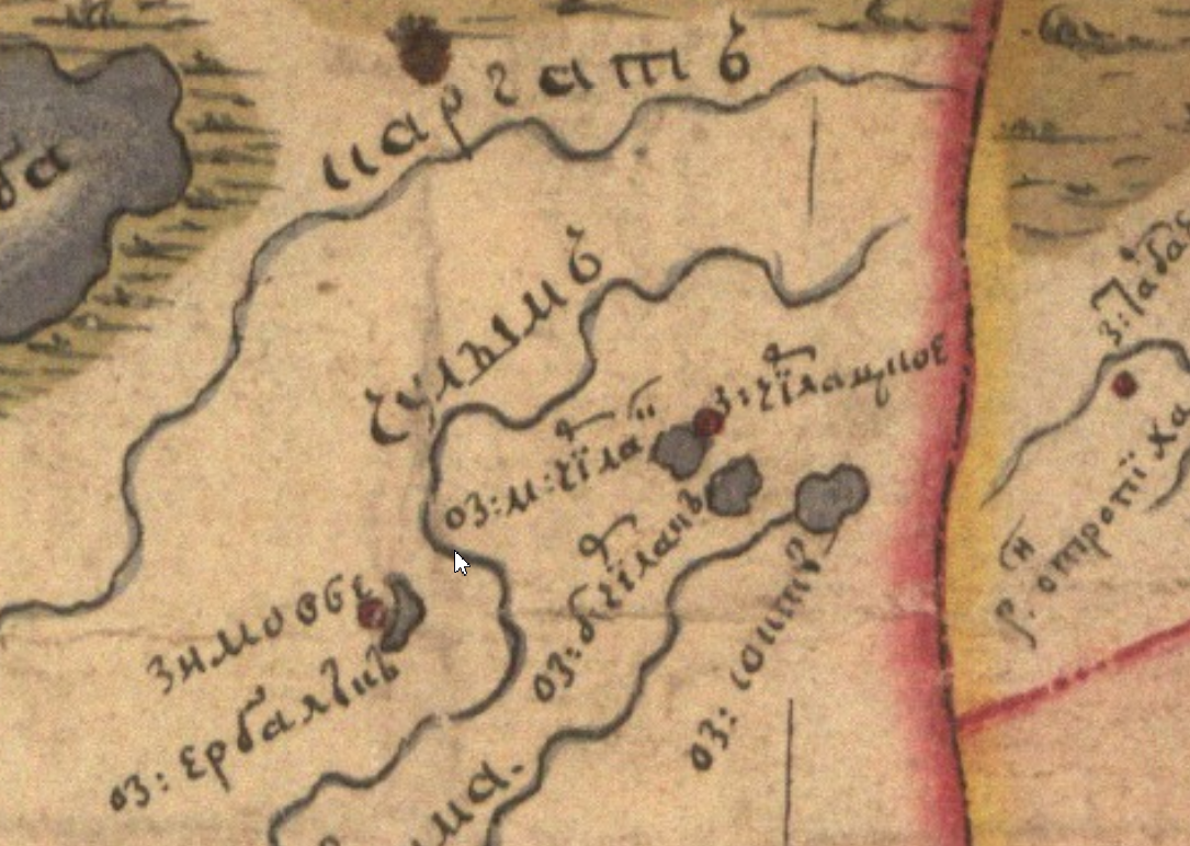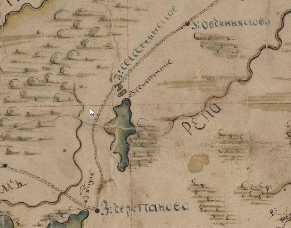 Показаны зимовье Сектинское и одноименное озеро между зимовьями Овчинниково и Черепаново (Иткуль)