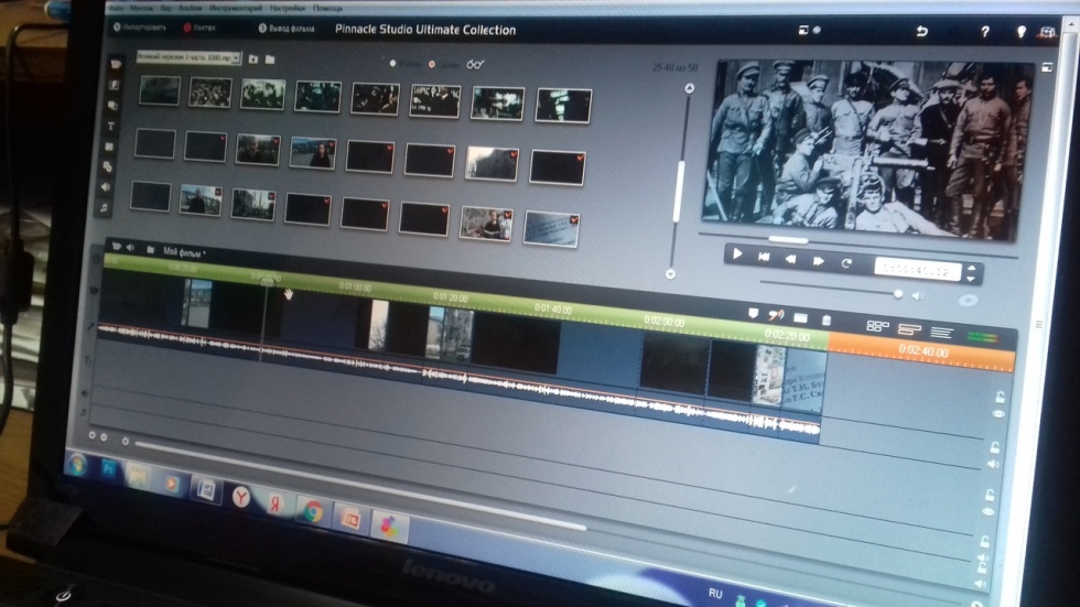 После внесения педагогом поправок в сценарий началась сложная техническая часть проекта – создание видеоряда. Конечно же, никакой документальной кинохроники, рассказывающей о революционных событиях в Татарском районе, в распоряжении обучающегося не имелось, поэтому видеоряд студенту нужно было создавать самому. Для «фоновых» кадров на любительскую видеокамеру были отсняты фасады зданий, которые существовали в описываемых событиях, оцифрованы фотографии, запечатлевшие Татарск начала ХХ века, использованы фрагменты документальной кинохроники революционной России, взятые в сети интернет. Стенд-апы снимались в местах описываемых событий. Затем готовилась «аудиодорожка» – записан закадровый голос и подобраны музыкальные темы.