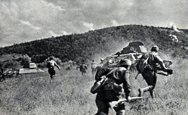 «Серия красных ракет прочертила небо. Сигнал! Поворот рукоятки – и все задрожало, поднялось вверх, посыпался каменный дождь. На тысячу метров, вдоль фронта, огненная змея – это взорвались минные поля. Проволочные заграждения разорваны и отброшены. Образовалась широкая «зеленая улица». Наша пехота поднялась во весь рост и с криками «Ура!», «За Родину!» пошла в атаку и развернула наступление на шоссе.