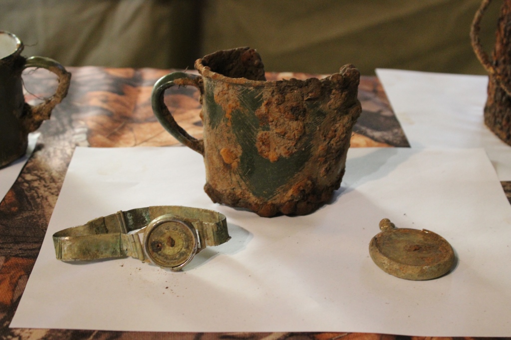 Из всех находок поисковиков самыми ценными считаются те, которые являлись личными вещами бойцов, которые до сих пор хранят их тепло: котелок, чашка, часы, стеклянная фляжка, ложка, эмалированная кружка. Всё это вы сейчас видите перед собой.
