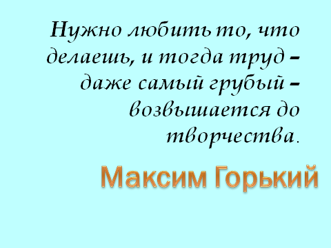 Знакомство обучающихся со словами известного русского писателя Максима Горького, объяснение смысла данного высказывания Здравствуйте, ребята! Я очень рада вас видеть, надеюсь, нам сегодня с вами будет интересно. Мне приятно видеть вас в добром расположении духа. Ваши умные глаза говорят о том, что вы будете сегодня активными и доброжелательными. Я бы хотела начать нашу беседу словами известного русского писателя Максима Горького Нужно любить то, что делаешь, и тогда труд – даже самый грубый – возвышается до творчества. Прошу вас их прочесть. Как вы понимаете смысл данного высказывания? |