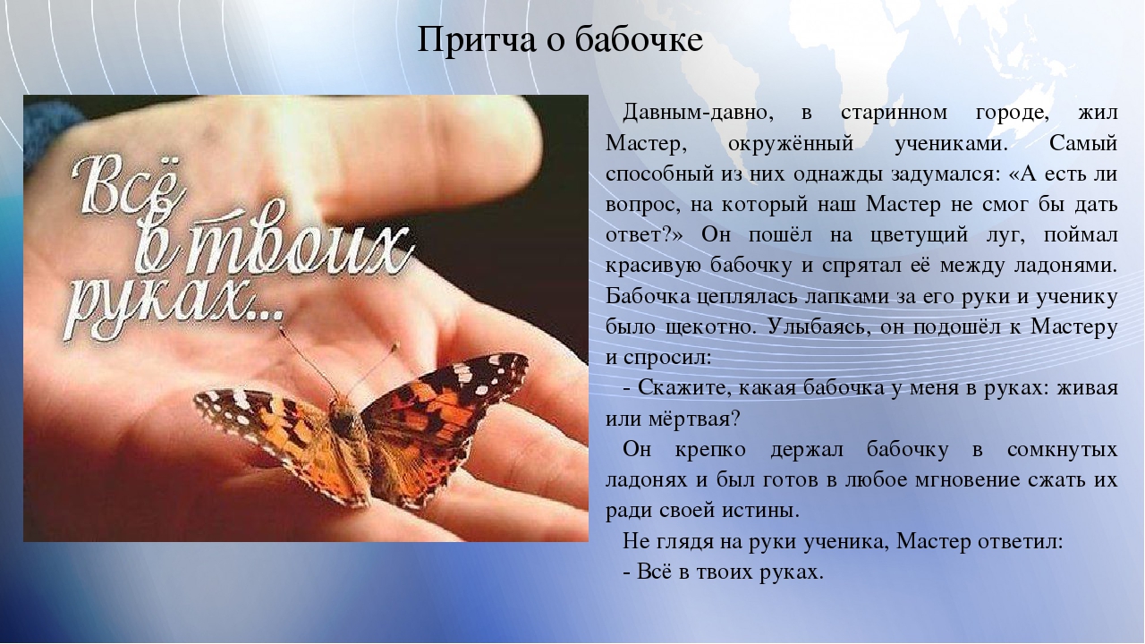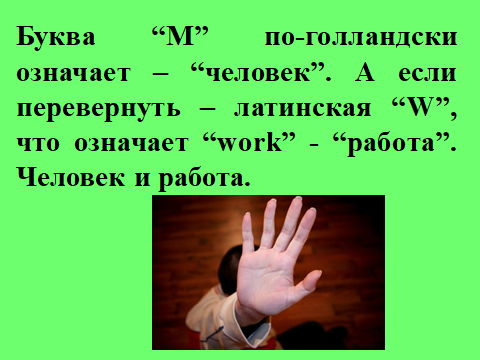 Легенда о голландских семьях. Беседа о понятии «труд». Вывод - выбирая профессию, человек выбирает свою судьбу. Говорят, что “человек рождается два раза», считая вторым его рождением выбор профессии. Рождение человека как профессионала – процесс сложный и индивидуальный. Формирование готовности человека к вхождению в новое качество – работника, специалиста, профессионала – уходит корнями в его детство, юность. Например, бытует легенда, что в голландских семьях (будь то самая богатая или самая бедная семья), когда рождается ребенок и только начинает что-то понимать, мать берет его ладошки и показывает ребенку на них две извилинки (они всегда есть на ладошках). Буква “М” по-голландски означает – “человек”. А если перевернуть – латинская “W”, что означает “work” - “работа”. Человек и работа. Так, во все времена, труд – необходимая основа жизни и развития человека и общества. Пройдет совсем немного времени, и вам придется выбирать свой путь в жизни. И путь этот начнется с перекрестка, от которого расходятся не 3, как в сказке, а 50 тыс. дорог - именно столько сейчас существует профессий. И очень важно не ошибиться в выборе пути. Ведь от этого выбора зависит очень многое: и материальный достаток, и круг общения, и интересы, и счастье в жизни. Недаром говорят, что, выбирая профессию, человек выбирает свою судьбу. |