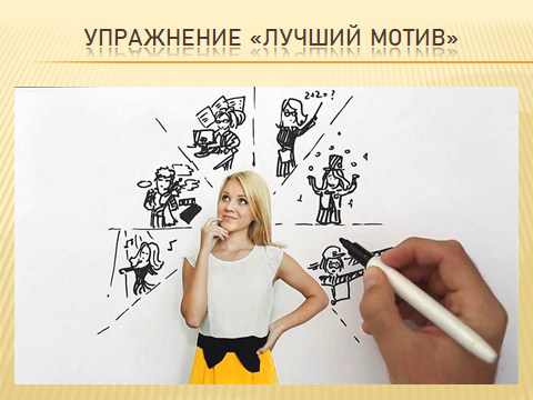 Упражнение «Лучший мотив» Задание: зачеркнуть 8 мотивов, 4 мотива, 2 мотива, 1 мотив – лишние мотивы, которые в меньшей степени руководят ребятами. Упражнение «Лучший мотив» У вас на рабочих столах лежат карточки, ознакомьтесь с ними. В течение 2 минут зачеркните 8 из 16 мотивов, которые к вам меньше всего относятся. У вас осталось 8 мотивов. Следующие задание - зачеркнуть 4 мотива, которые в меньшей степени руководят вами. Потом нужно исключить еще 2 менее важных из четырех. И потом удаляем еще один из двух. Обобщение: мы увидели собственное отношение к труду и к профессии, определили свои ценности. |