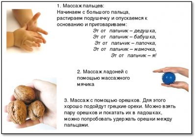 Развитие мелкой моторики для приобретения навыков, необходимых для письма, у детей с дизартрией должно вестись по различным направлениям: пальчиковый массаж; пальчиковая гимнастика; занятия ручной умелостью. Пальчиковый массаж становится стимулятором деятельности мозговых структур, обеспечивая развитие мелкой моторики, так и преодоление речевых нарушений.