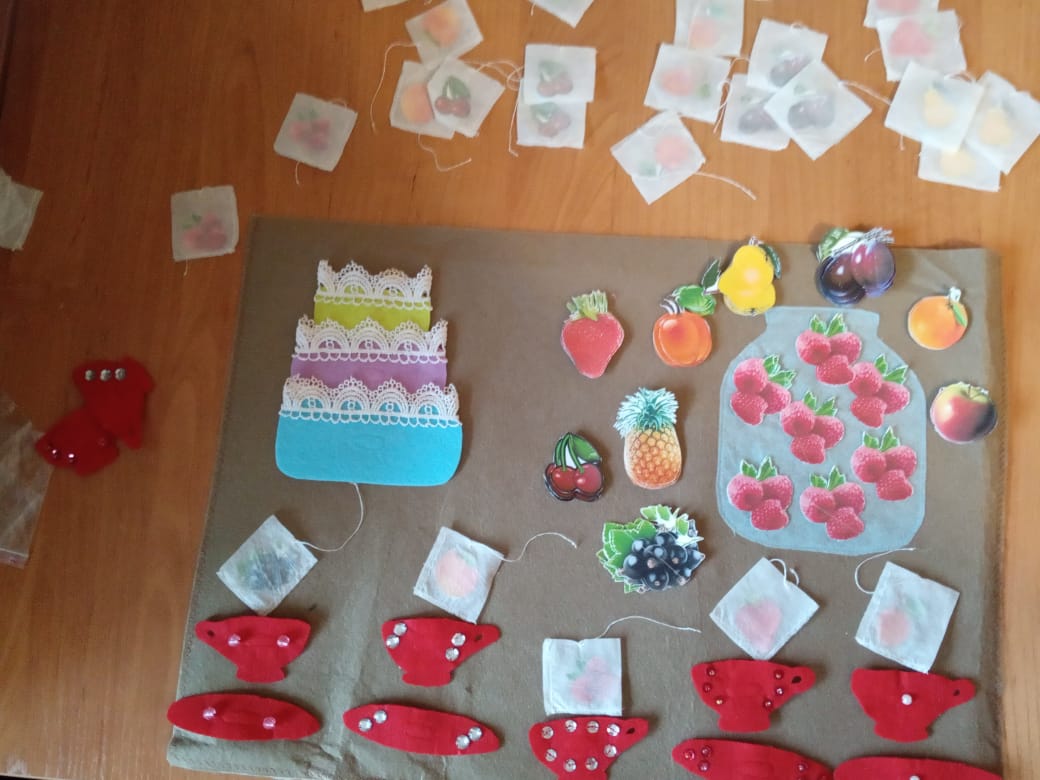 Для развития речи, выполнения артикуляционной гимнастики, автоматизации и дифференциации звуков, для развития речевого дыхания и фонематического слуха, для расширения лексического словаря, проработки связной речи нами было изготовлено панно «Чаепитие». Данное пособие изготовлено из фетра размером в длину 50 см, в ширину 35 см и является многофункциональным, помогает развить представления ребёнка о цвете, форме, величине, количестве, качестве предметов. На панно в определенных местах пришита липкая лента, на которую можно крепить различные элементы.