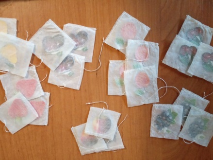 Внизу располагаются чайные чашки с блюдцами. Все они изготовлены из одного материала, но с разными украшениями. Детям предлагается подобрать пару. Кроме того, имеются чайные пакетики с различными ягодами. Дети могут предложить попить фруктовый чай в каждой отдельной чашке.