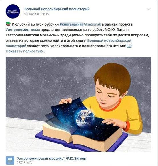 В рамках рубрики «Книга научит» раз в месяц в группе ВКонтакте читателю предлагается в электронном варианте на самостоятельное изучение какая-то книга по астрономии, а также ряд вопросов, ответы на которые содержатся в этой книге. С начала запуска проекта были представлены уже пять книг, рубрика приобрела постоянный характер.