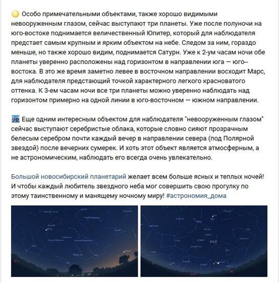 Раз в месяц рубрика «Звёздный навигатор» в группе ВКонтакте предоставляет общий обзор актуального звёздного неба Новосибирска и его ярких объектов, видимых «невооруженным глазом» в черте города.