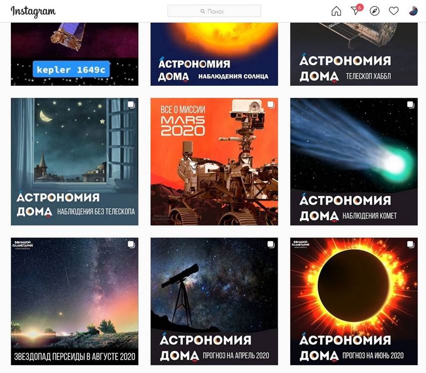 В Instagram-аккаунте Планетария в рамках проекта «Астрономия дома» каждый месяц предоставляется обзор грядущих астрономических событий. Там же были подготовлены и опубликованы событийные наглядные астрономические карточки по таким темам, как «Наблюдения Солнца», «Наблюдения комет», «Наблюдения без телескопа», «Телескоп Хаббл».