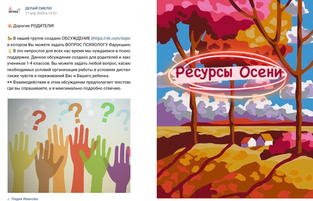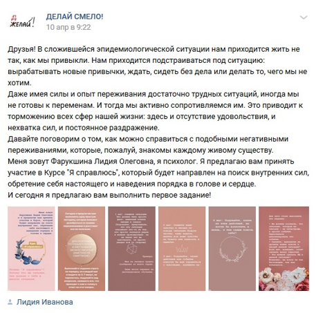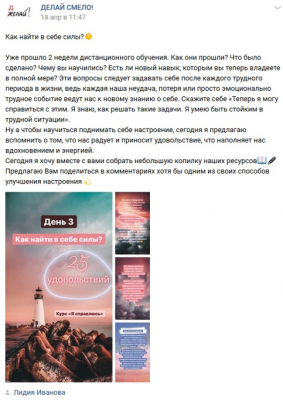 Во время периода самоизоляции воспитательная служба нашей школы создала проект «Делай смело», в рамках которого я, как педагог-психолог, создала мини-курс психологической самопомощи «Я справлюсь», в рамках которого помогала подросткам и их родителям адаптироваться к новым вынужденным условиям обучения. Я создавала посты в группе, в которых давалась информация и небольшие задания.