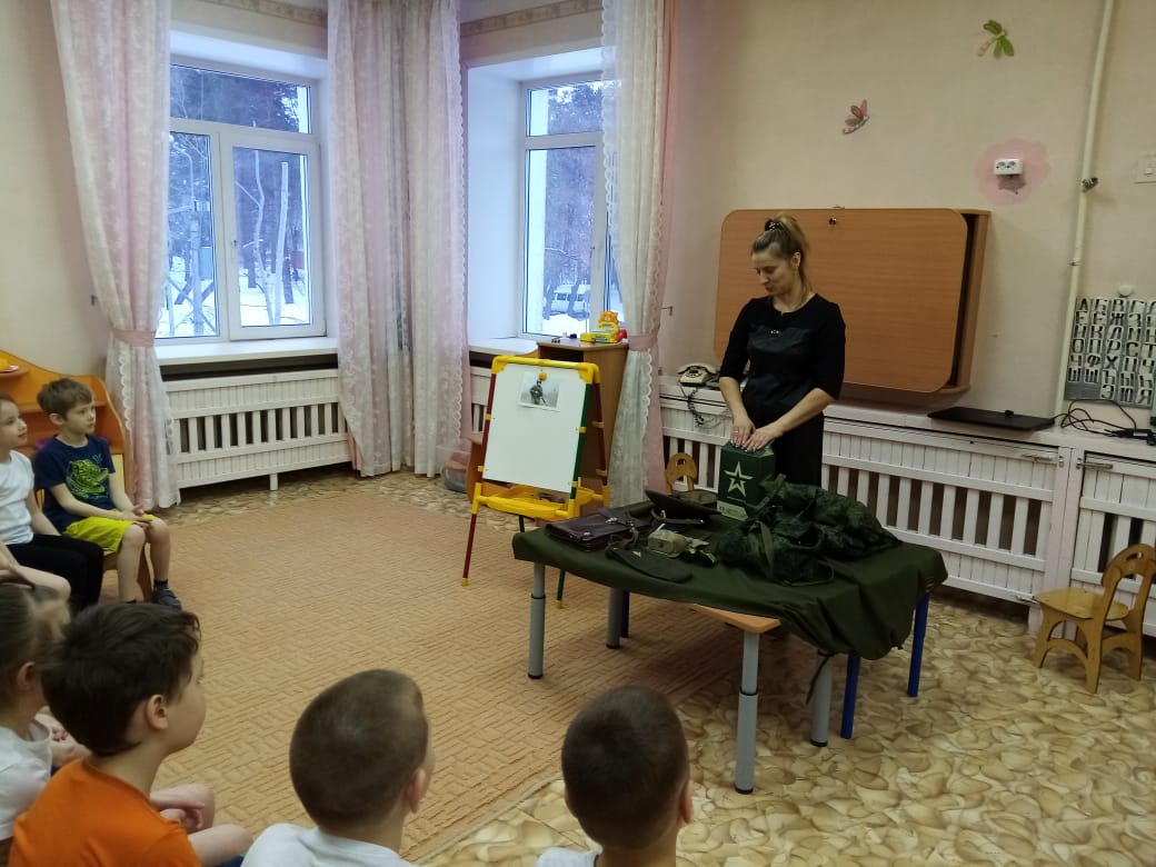 Также в нашей группе проходили открытые занятия на тему «Служить России», где была показана не только презентация, но и был организован мини-музей, представляющий военную атрибутику: саперная лопатка, плащ-палатка, учебная граната, шлем танкиста, фуражка, каска, пилотка, фляжка для воды, сигнальные флажки, раскладушка с предметами первой необходимости, индивидуальный рацион питания, папка-планшет. Дети могли не только увидеть, но и имели возможность сфотографироваться с данным инвентарем в специальной фотозоне, от чего получили огромное удовольствие и заряд положительных эмоций.
