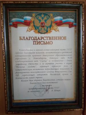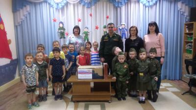 Также у нас был опыт работы с командованием и личным составом воинской части 73727 через акцию «Посылка солдату», которая была приурочена к празднованию Дня Защитника Отечества и имела обратную связь от командования и личного состава воинской части в лице подполковника, приезжавшего в детский сад, проводившего беседу на тему «Я – солдат», где наши дети лично вручили посылку солдату и диск с поздравительной записью песни «Смуглянка». Посылка была доставлена адресату и командир полка на построении вручил ее солдатам. Солдаты были благодарны совместной работе родителей и детей. В посылку входили: кондитерские изделия, предметы личной гигиены и канцелярские товары. Благодарность исходила не только от солдат, но и от командира воинской части 73727 гвардии полковника А. Шокина, который, в свою очередь, прислал благодарственные письма на адрес детского сада и в отдел образования.