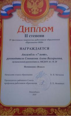 Воспитатели нашего детского сада приняли участие в IV фестивале творчества работников образовательных организаций Новосибирской области – членов Профсоюза «Признание-2020», посвященном 75-летию Победы в Великой Отечественной войне. Фестиваль проводился под девизом «Победа в сердцах поколений» и воспитатели нашего детского сада были награждены дипломом II степени в номинации «Вокал» за выступление в военной форме с песней «Девочки на войне» и стихотворением «Зинка».