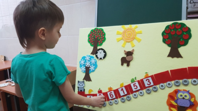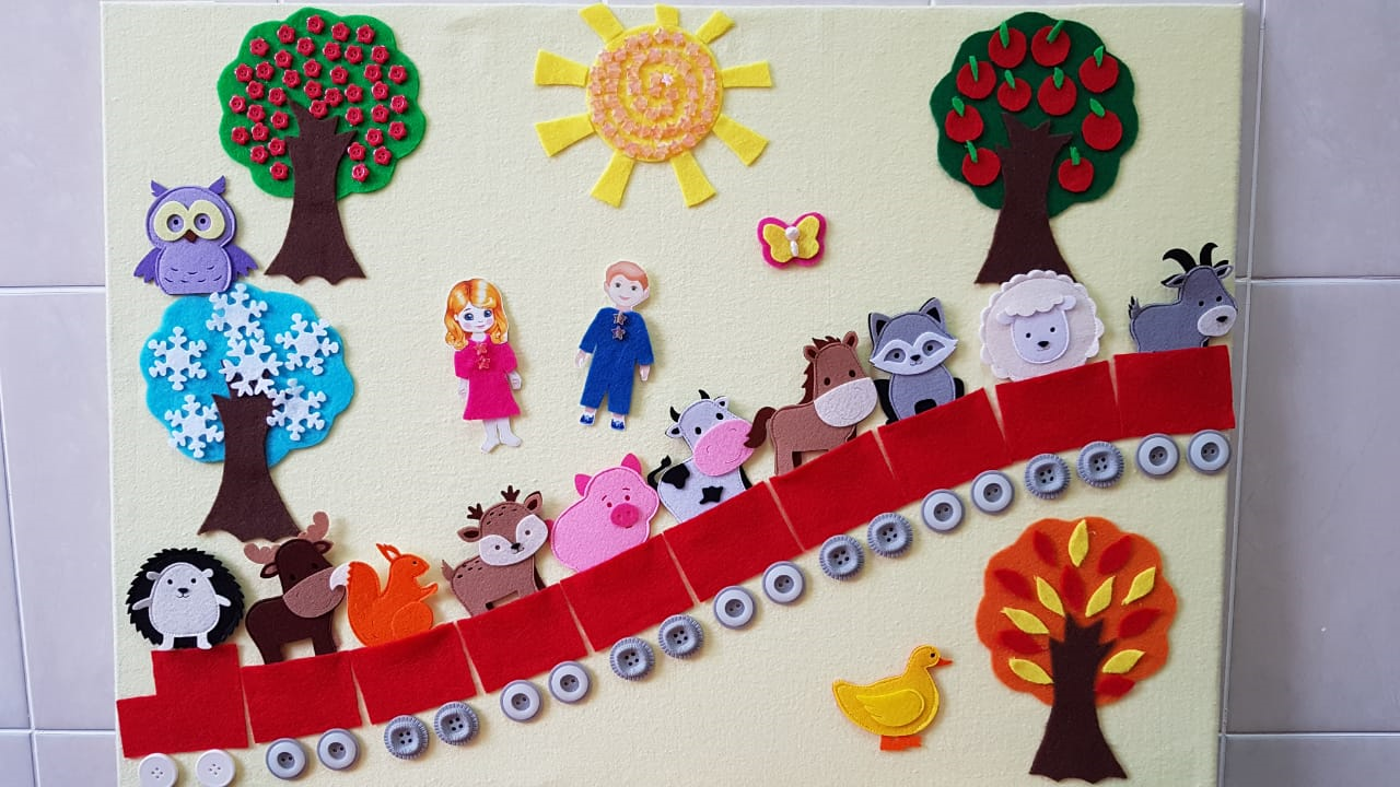 Описание: Пособие представляет собой панно прямоугольной формы, 50*70 см, покрытое фланелевой тканью, с использованием элементов декора из фетра. На панно расположены: поезд, состоящий из 10 вагонов; 4 дерева, оформленных в соответствии с временами года; солнце; набор листьев. Пособие имеет яркий, привлекательный вид и вызывает интерес детей, побуждает к многократной игре с ним.