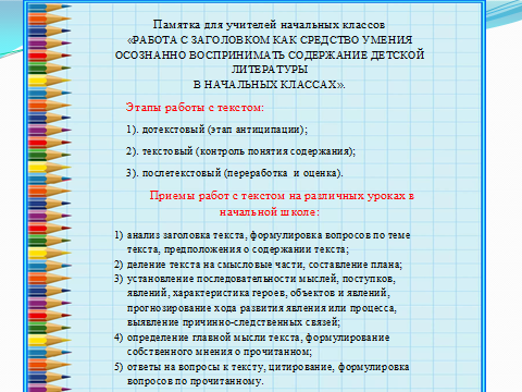 Одним из первых приемов понимания текста в начальной школе является осмысление заголовка. Заглавие направляет интерес маленького читателя к тому, о чем будет повествоваться далее. Оно является путеводителем читателя в художественном мире произведения. Для младших школьников задание «озаглавить текст» служит, прежде всего, средством осознания смысла текста, проверкой понимания прочитанного.
