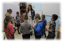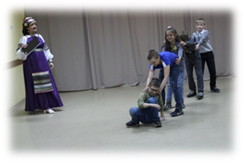 Следующим этапом программы стала музыкально-танцевальная площадка, где ребята знакомились с основными видами танцевально-театральных игр, направленных на умение сочетать одновременно три компонента: движение, речь и игра. После чего была разучена танцевальная композиция по мотивам сказки «Приключение Буратино». На игровой площадке дети играли в ролевые игры, предлагаемые педагогом («Баба Яга», «Снеговик», «Заводная кукла», «Самолеты и бабочки», «Буратино и Пьеро»). Дети активно играли, веселились, пробовали себя в роли актеров. В этих играх они перевоплощались, развивали внимание, воображение, находчивость, умение создавать образы с помощью мимики, жеста, пластики. А в конце ребята пробовали применить эти навыки в русской народной сказке «Репка».