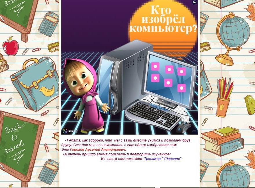 Ежедневно в учительском блоге предлагаются рекомендуемые задания на выбор, которые подкрепляются видеоуроками, схемами, тренажерами, играми. Блог как игровая онлайн-площадка позволяет размещать контент, созданный с использованием «мозаики цифровых ресурсов», например, проект «Увлекательное путешествие с Машенькой» (https://rdtcnbuhfheccrbqzpsr.blogspot.com/). В рамках интерактивной викторины ученики расширяют свой кругозор, узнают о современных технологиях и изобретателях.