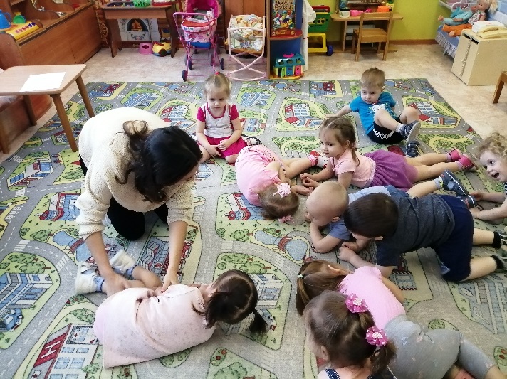 Игра «Надуй куклу» – старшие группы. «Музыка на усмотрение педагога». Дети разбиваются на пары. Один участник стоит с опущенной головой, согнув ноги и руки. Он – «кукла». Его партнёр – «насос». По команде «насос» начинает сгибать и разгибать туловище, а «кукла» – распрямлять конечности, поднимать голову, то есть «надуваться». Когда «кукла» полностью надута, партнёры меняются местами.