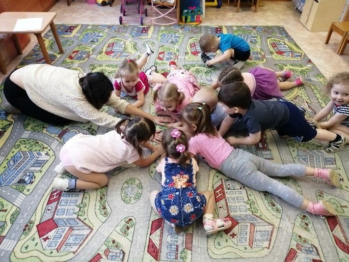 Игра «Спящий котенок» на релаксацию. Первая, вторая младшие группы. Музыка Р. Паулс «День растает, ночь настанет», «Колыбельная». Поднимаются и опускаются животики. Дети, изображая котят, ложатся на коврик.