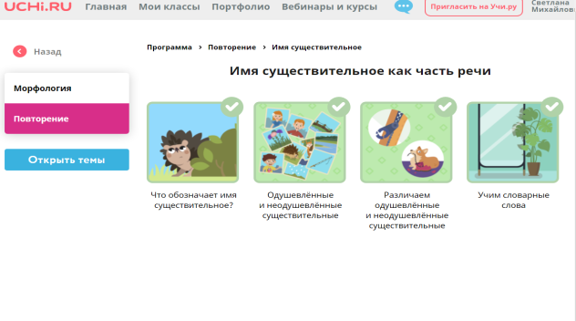На платформе Учи.ру все задания представлены в игровой форме. Например, «Путешествие по частям речи», раздел «Имя существительное». Даны задания на определение части речи, знаний морфологических признаков.