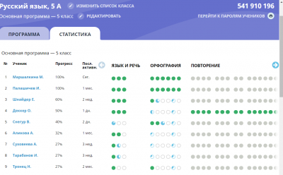 Очень удобно на платформе отслеживать успеваемость обучающихся по пройденным ими темам и модулям. При рассмотрении таблицы можно увидеть количество и качество пройденных заданий, время прохождения, прогресс ученика.