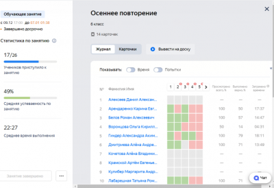 Есть возможность сделать анализ выполненных заданий. В таблице указаны все критерии, которые необходимы учителю: сколько попыток сделано для выполнения карточки, сколько заданий выполнено и каков % успеваемости. На основании этой диаграммы можно увидеть все пробелы в знаниях обучающихся и направить их на исправление.