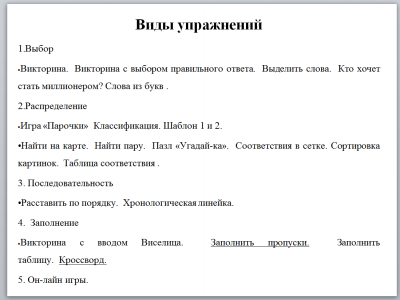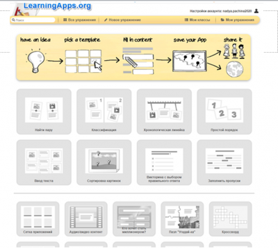 При помощи шаблонов сервиса LearningApps.org можно создавать следующие виды упражнений, вы видите их на экране.