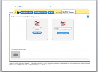 4. Можно выбрать видео, скопировав ссылку из YouTube. При создании вопроса вы выберете необходимый фрагмент, установив поля с временем. Далее так же прописываем подсказку и ответ.