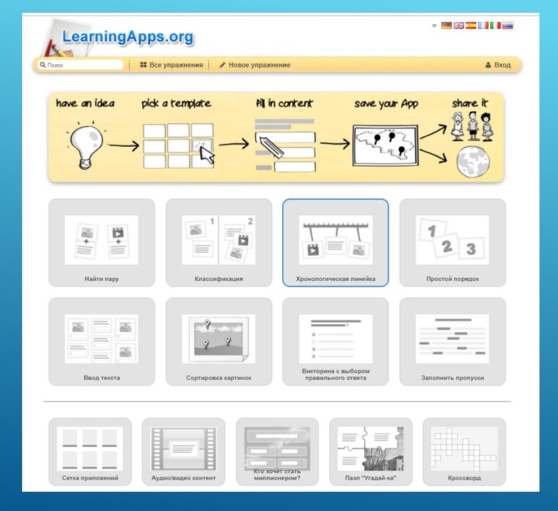 Конструктор интерактивных заданий Learning Apps предназначен для поддержки процесса обучения с помощью интерактивных модулей, при помощи которых можно подготовить увлекательные электронные интерактивные игры и викторины, упражнения и задания для детей разного возраста. На сайте имеются готовые интерактивные упражнения, систематизированные как по популярности, так и по предметным областям, а также дифференцированные по возрасту. Для удобства педагога и учащихся на сервисе представлено более 20 шаблонов-образцов для создания интерактивных дидактических материалов.