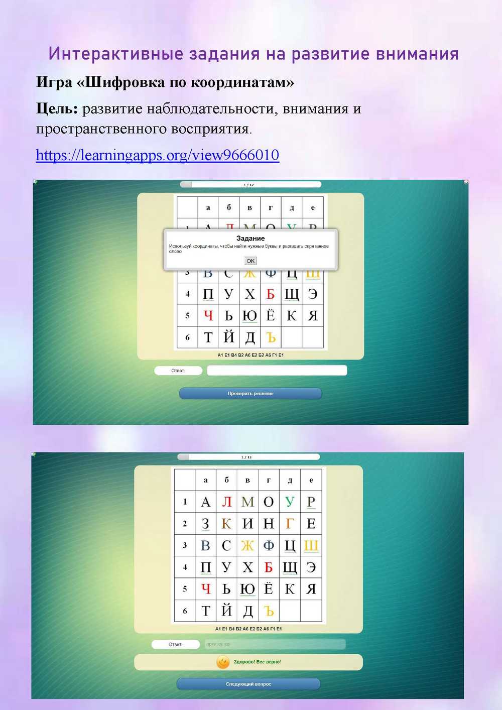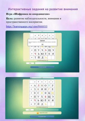 Дистанционная форма обучения посредством интерактивных заданий дает возможность ребенку совместно с родителем самостоятельно выбрать время, место, темп и траекторию обучения. Для успешной работы ребенку, под контролем родителей, необходимо лишь пройти по ссылке и выполнить задание. Правила выполнения каждого задания доступны детям старшего дошкольного и младшего школьного возраста и прописаны в инструкции, которая открывается непосредственно перед каждой игрой.