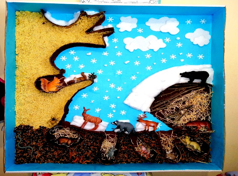 Для проведения опытов с водой и изучения её свойств, здесь находятся формочки для льда, сахар, вода, кисточки, гуашь. Для проведения опытов с воздухом и его изучения, тут находятся трубочки, мыльные пузыри. Трубочки не подлежат обработке, они одноразовые, на каждое новое проведение опытов с воздухом, я беру новые, не использованные трубочки. Для проведения опытов с природного материала, здесь находятся песок, земля. Для исследования звука, я создала «Душистую коробочку» с различными запахами – это лимон, апельсин, кедр, сосна, лаванда, можжевельник. Для исследования звуков я создала «Шумящую коробочку» с различными звуками. Это звук разных круп: рис, горох, манка, гречка, макароны, пшено, также имеются различные дудочки. Природный материал – это контейнеры с ракушками, камнями, пластмассовыми крышками, с сухими листьями, с киндерами, с фундуком, со скорлупой от грецкого ореха, с желудями, с деревянными пробками, а также сухие листья цветов. Для того чтобы дети знали, что можно трогать и что смотреть в мини-лаборатории, нам помогают наши помощники – условные обозначения. Если дети видят глаз – это значит можно смотреть, если руку, то можно трогать, если видят руку с красной полоской, это значит трогать нельзя, только в присутствии взрослого, если изображено ухо – можно слушать, если губы с красной полоской, то в рот брать нельзя. Также в нашей лаборатории есть всевозможные, уникальные коллекции: это коллекция пуговиц, коллекция круп, коллекция фантиков, коллекция ракушек, коллекция камней. Различные макеты – «Животные зимой», «Животные осенью».