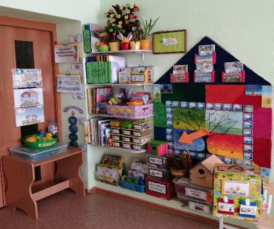 Пятый блок – это «Наша игротека». Там расположены различные экологические игры, игры на прищепках «Времена года», «Кто, что есть?», «Чей листок?», «Чей хвостик?», дидактические игры – «Найди тень», «У кого какой домик?», «Собери картинку», «Разложи овощи и фрукты в корзинку», «Разложи фрукты в баночки», лото животных и растений, шнуровки – фрукты, альбом тактильных ощущений, сенсорная коробка, дидактическая игра «Собери листья», многообразные муляжи домашних животных и птиц, диких животных, овощей и фруктов, деревянные и фетровые скворечники для птиц. В центр природы и экспериментов я разработала авторское пособие – сундучок исследователя Знайки. Он очень яркий, интересный. Привлекает внимание детей своей эстетичность и новизной. Также у нас есть центр воды и песка. Там расположен контейнер с кинетическим песком, разными формочками и мелкими игрушками. Тазик для воды, резиновые и пластмассовые игрушки в виде уточек, мячики, шары. Ёмкость с водой.
