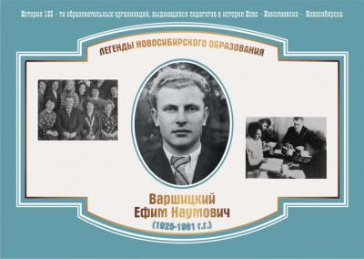 Ефим Наумович Варшицкий родился в 1925 году, окончил Новосибирский государственный педагогический институт по специальности «Учитель английского языка». Первый педагогический опыт Ефим Наумович получил в Кыштовской средней школе, куда отправился после окончания НГПИ. С 1958 года педагог работал в школе № 10 города Новосибирска в должности завуча. А с 1963 по 1981 год Ефим Наумович был директором в этой школе. Период, когда он возглавлял школу, называли «школой Варшицкого». Это новаторская школа, специализированная английская, физико-математическая, спортивная, производящая собственную продукцию в школьных мастерских, занимающаяся научной организацией труда школьников и учителей.