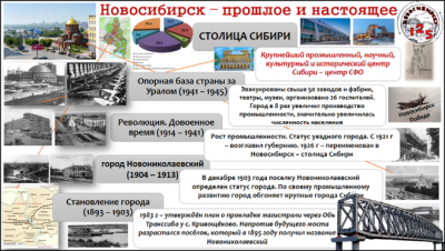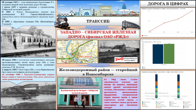 Можно путешествовать и во времени. Создавая инфографику в одном из заданий для Географической дистанционной областной олимпиады, посвящённой 125-летию Новосибирска, ученики 9 класса изучили основные этапы становления города и Западно-Сибирской железной дороги.