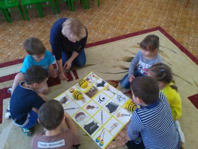 Дети, ищут картинку с балалайкой, программируют путь на спинке пчелы. Когда пчела доходит до картинки, на экране появляется изображение инструмента и дети слушают его звучание.