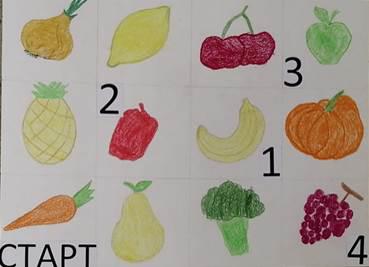 Команда «Здоровячок» 1 станция: «Посади огород, сад» Дети раскладывают муляжи овощей и фруктов на «грядку» или на «дерево» 2 станция: «Витамины» Детям предлагают раскрасить овощи, фрукты и ягоды содержащие витамин С (лимон) – желтым цветом, витамин Е (черника) – синим, витамин А (морковь) – оранжевым, витамин В (яблоко) – зеленым. 3 станция: «Яблочко» физ.минутка 4 станция: «Где растет каша?» Дети определяют какое растение подарило нам гречку, рис, манку…подбирают к иллюстрации растения мешочек с соответствующей крупой. Под одним из мешочков дети находят часть ключа. Команда «Часовички» 1 станция: «Режим дня дома» Дети раскладывают карточки с режимными моментами по порядку, проговаривая последовательность действий. 2 станция: «Угадай время суток» Дети распознают время суток. (в какое время суток мы чистим зубы, делаем зарядку, завтракаем…) 3 станция: «Зарядка» физ.минутка. 4 станция: «Один день из жизни кота». Дети следят по полю за котом и проверяют все ли режимные моменты кот соблюдает, добавляют недостающие карточки и находят часть ключа.