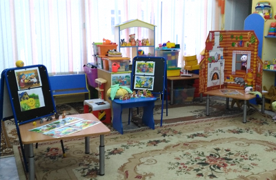 Материалы и оборудование: макет избушки (игрового домика), персонажи деда и бабы, разрезные картинки «Собери яичко», мягкий муляж репки, герои настольного театра «Колобок».