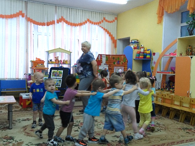 Воспитатель: Поедем дальше? Вставайте паровозиком.