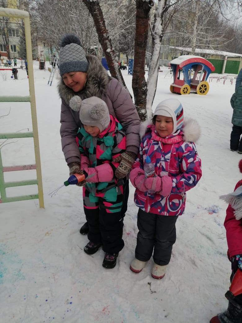 Оформление территории (разноцветные ленточки, флажки), воспитатели предлагают детям к празднику принести санки и бутылочки с разноцветной водой.