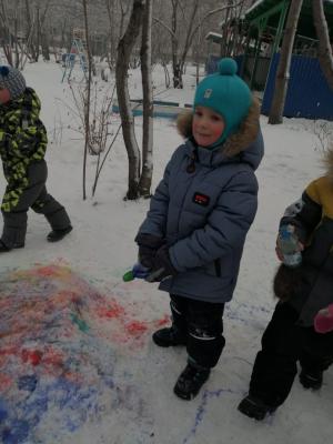 (зима и ведущий раздают детям бутылочки с разноцветной водой, дети раскрашивают сугробы в разные цвета. Петрушка с Бабой Ягой помогают)