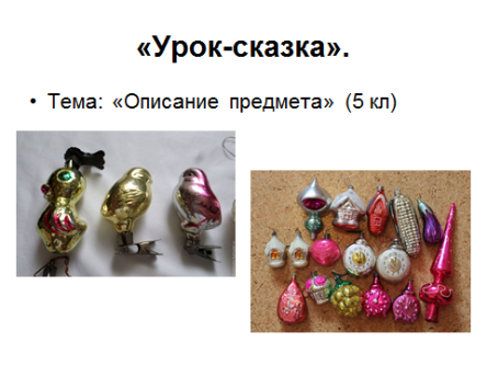 Также в 5 классе на уроке по развитию речи на тему «Описание предмета» предлагаю описать ёлочную игрушку. Для этого знакомимся в музее с елочными игрушками 50-80 годов XX века. Ребятам предоставляется возможность взглянуть на игрушки-ровесники своих родителей, бабушек и дедушек, сравнить их с современными игрушками и описать в своих творческих работах.