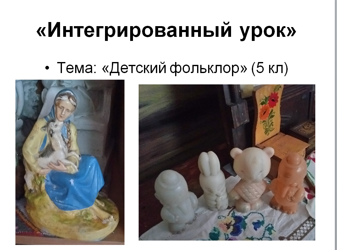 На уроке литературы в 5 классе, изучая фольклор, провожу интегрированный урок «Детский фольклор». Знакомимся с детскими игрушками двадцатого века, играми детей, как одевались дети, какие книги, журналы читали. По возвращении в класс знакомимся с жанрами детского фольклора. В качестве домашнего задания предлагаю обучающимся представить себя детьми, ровесниками их бабушек и дедушек, инсценировать один из жанров детского фольклора.