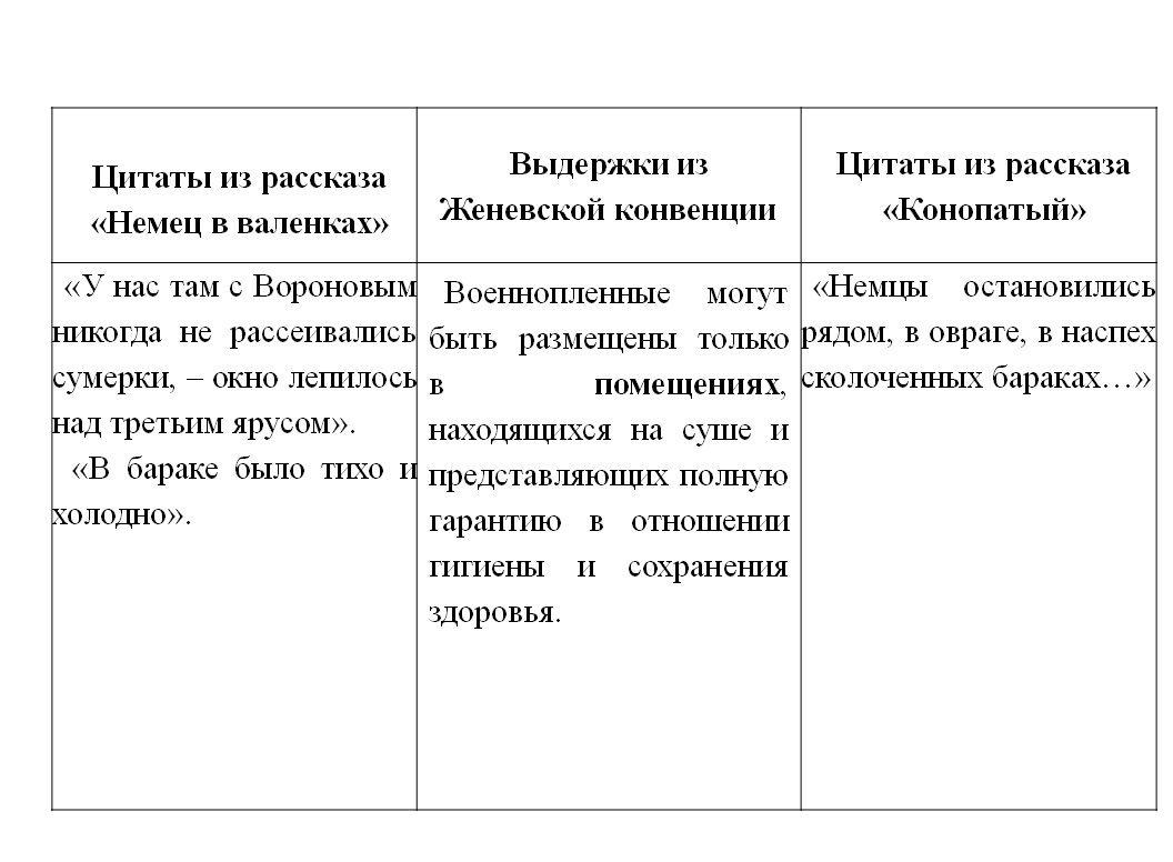 В процессе работы решили сравнить два рассказа. Первый – «Немец в валенках», написанный в 1966 году, автор К. Воробьёв, и рассказ «Конопатый», 2003 год, автор Г. Цыплёнкова. По мере прочтения художественных произведений необходимо было заполнить таблицу с выдержками из статей Женевской конвенции цитатами и сделать вывод: соблюдаются ли права военнопленных в XX и XXI веках. Естественно, мы обращались к музейным источникам, изучали историю ВОВ в жизни Венгеровского района, конечно, знакомились с подвигом земляков – Героев СССР.