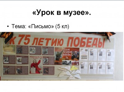 В 8 классе традиционно в апреле провожу «Урок Победы». Мы идем в школьный музей, где организована тематическая выставка. Пытаемся погрузиться в атмосферу того времени, знакомимся с экспонатами выставки, читаем стихи и отрывки из прозаических произведений военных лет, обучающиеся рассказывают истории своих семей. Аналогично организую и «Урок Мужества» в 7 классе.