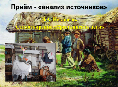 При изучении стихотворения Н.А. Некрасова «Крестьянские дети» использую прием – анализ источников. В школьном музее знакомимся с жизнью и бытом детей крестьян и только потом приступаем к чтению и анализу произведения.