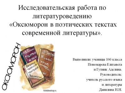 В районном музее периодически проходят выставки творчества местного поэта Т.А. Нивалёновой: картины, стихи. Посетив с обучающимися 10б класса такую выставку, мы решили написать проект. И вот что у нас получилось – исследовательская работа по литературоведению «Оксюморон в поэтических текстах современной литературы (на примере творчества Т.А. Нивалёновой)».