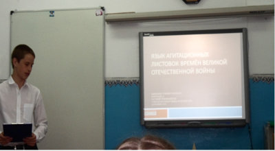 Колупаев Дмитрий пишет исследовательскую работу на тему «Язык агитационных листовок времен ВОВ». Цель предпринятого исследования заключается в выявлении лингвистических особенностей специфики агитационной листовки времён ВОВ.