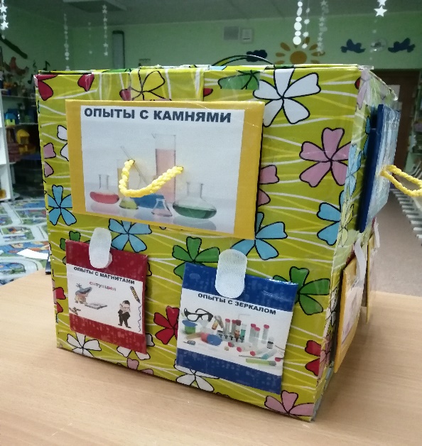 В сундучке я собрала и уместила весь комплекс опытов – опыты с бумагой, со снегом, с мыльными пузырями, с камнями, с солнцем, с магнитами, с водой, с тканью, с зеркалом, с тенью, с ветром и с песком.