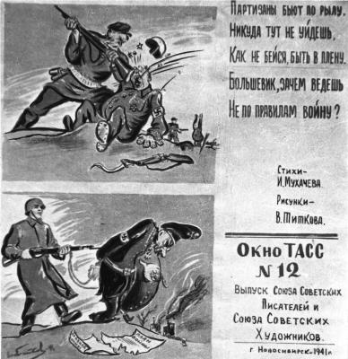 Из новых печатных агитационных материалов необходимо отметить «Окна ТАСС». В самые первые дни войны новосибирские писатели и художники решили выпускать агитационные плакаты в понятном населению сатирическом стиле. «Художники в красочных плакатах и лубках, а поэты в стихотворных подписях к ним мобилизуют массы на героизм на трудовом фронте, популяризируют героизм, патриотические подвиги воинов Красной Армии и партизан. В карикатурах, лубках разоблачается гнусное лицо фашизма и его вождей, их людоедство, их политику разбоя и угнетения народов» [6, л. 6–7].
